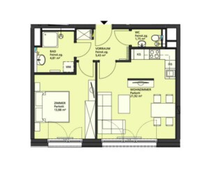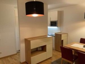 Über einen großzügigen Vorraum sind alle Räume zentral begehbar. Das Badezimmer ist mit Dusche, Waschtisch und Waschmaschine ausgestattet, das WC ist separat. Die helle Wohnküche mit West-Ausrichtung verfügt über große Fenster und eine hochwertige Einbauküche mit allen Geräten. Der angrenzende Wohnbereich ist teilweise möbliert und kann bei Bedarf übernommen werden. Der Schlafbereich bietet ausreichend Platz für Bett und Stauraum. Ein großes Kellerabteil ist vorhanden.