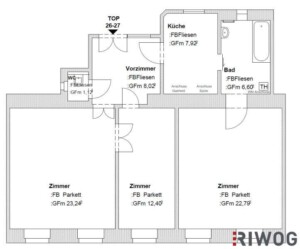 Raumaufteilung: Wohnzimmer, Schlafzimmer, Kabinett, separate Küche, Badezimmer, WC, Vorraum und Kellerabteil. Das Badezimmer ist mit Badewanne, Waschmaschinenanschluss und Handtuchwärmer ausgestattet, das WC liegt separat.
